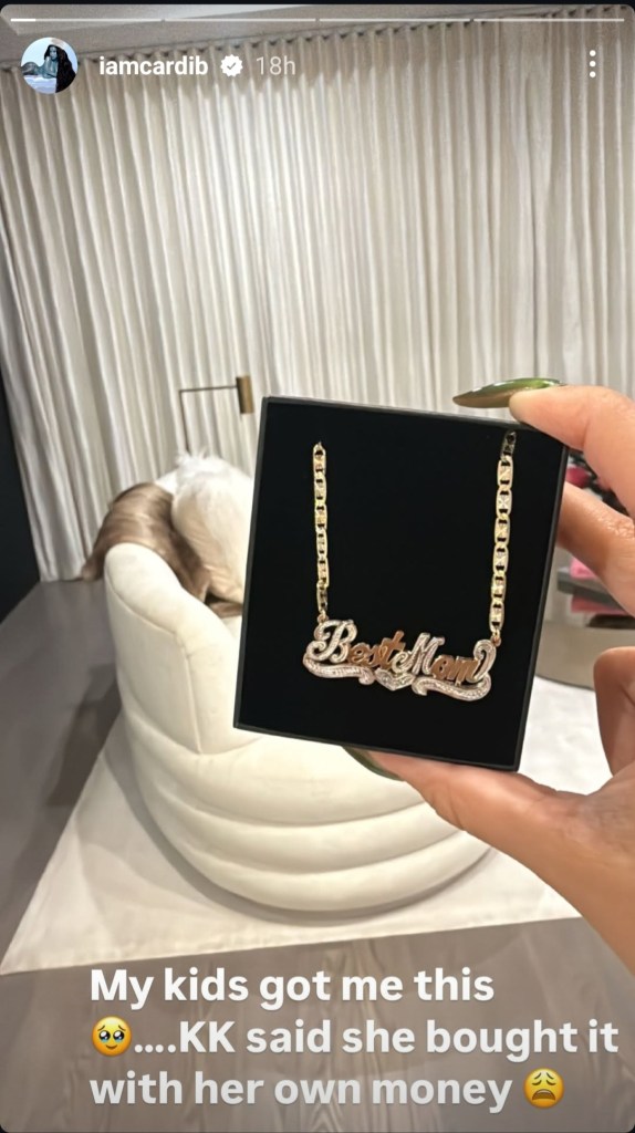 On May 12, Cardi B took to her Instagram Stories to share a picture of her Mother’s Day gift from her children. She posted an image of her holding a necklace with the words “Best Mom.” Cardi B wrote above the picture, “My kids got me this ….KK said she bought it with her own money. For context, KK is Kulture Kiari Cephus, the rapper’s first child with her estranged husband, Offset. The singer also used emotional emojis for the story, describing her sentiments upon seeing the “Best Mom” necklace.