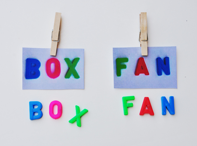 Start by taking pictures of simple words you would like your kids to learn. Make sure to keep the letters spaced evenly